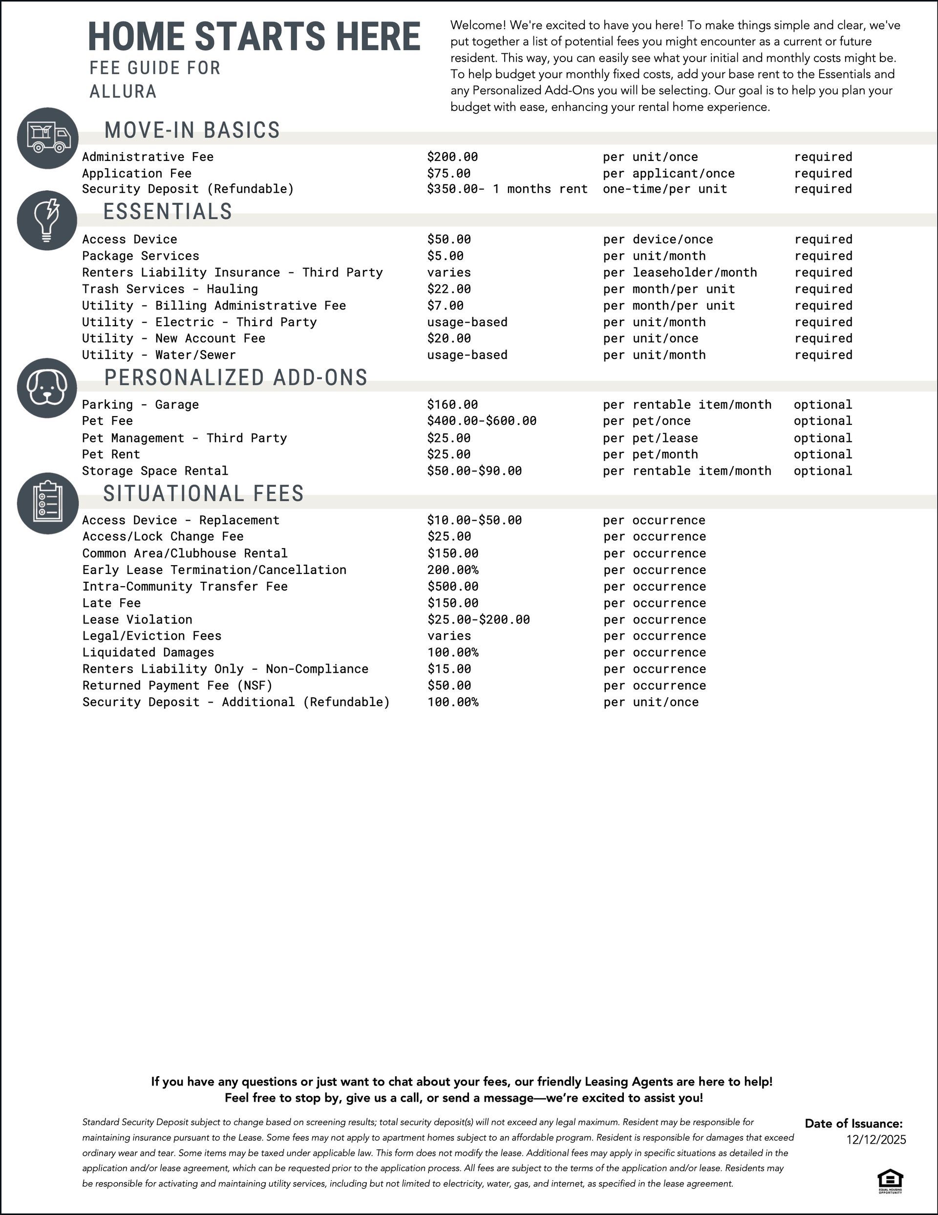 Our goal is to help you plan your budget with ease, enhancing your rental home experience. Prices shown are base rent. To help budget your monthly fixed costs, add your base rent to the Essentials and any Personalized Add-Ons you will be selecting from the list of potential fees which can be found at the bottom of the page.